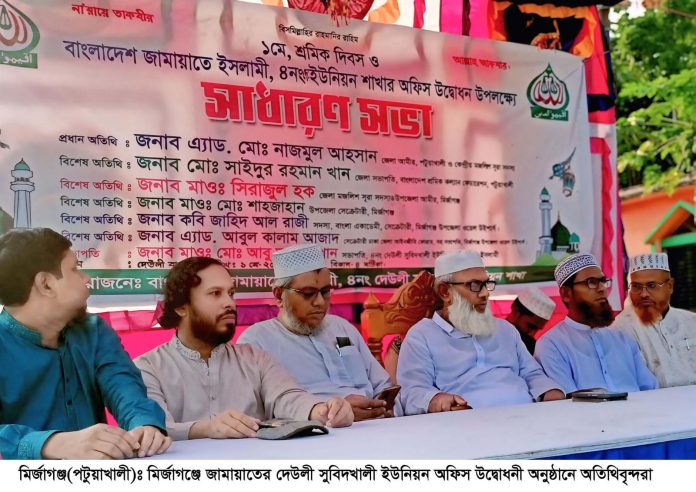 পটুয়াখালীর মির্জাগঞ্জে ১মে জাতীয় শ্রমিক দিবস ও বাংলাদেশ জামায়াতে ইসলামী দেউলী সুবিদখালী ইউনিয়ন শাখা অফিস উদ্বোধন উপলক্ষে সাধারন সভা অনুষ্ঠিত হয়েছে। বৃহস্পতিবার বিকেল চারটায় বাংলাদেশ জামায়াতে ইসলামী দেউলী সুবিদখালী ইউনিয়ন শাখার আয়োজনে উপজেলার দেউলী বাজারে অফিস উদ্বোধনকালে প্রধান অতিথি হিসেবে উপস্থিত ছিলেন পটুয়াখালী জেলা আমীর এ্যাড. মোঃ নাজমুল আহসান।